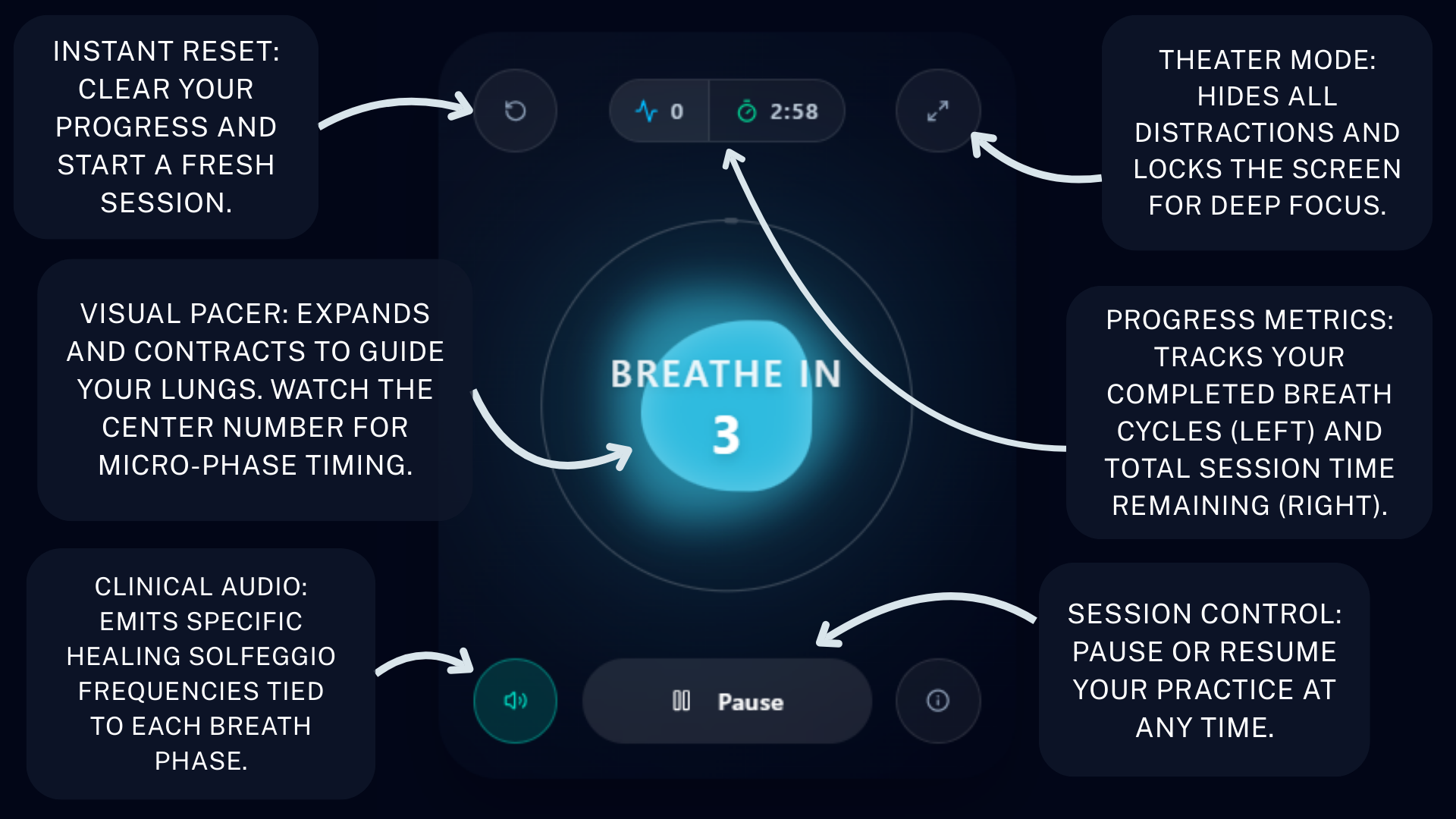 The core orb utilizes fluid dynamic rendering to mimic the natural expansion and contraction of the human diaphragm. Follow its movement with your eyes to automatically down-regulate your nervous system without counting in your head.